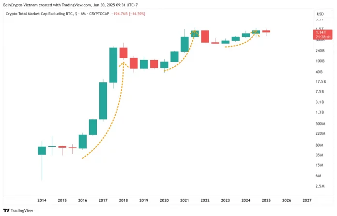In earlier cycles, 4 inexperienced six-month candles sometimes ended with two purple candles, suggesting that the second half of 2025 might stay difficult for altcoins.
