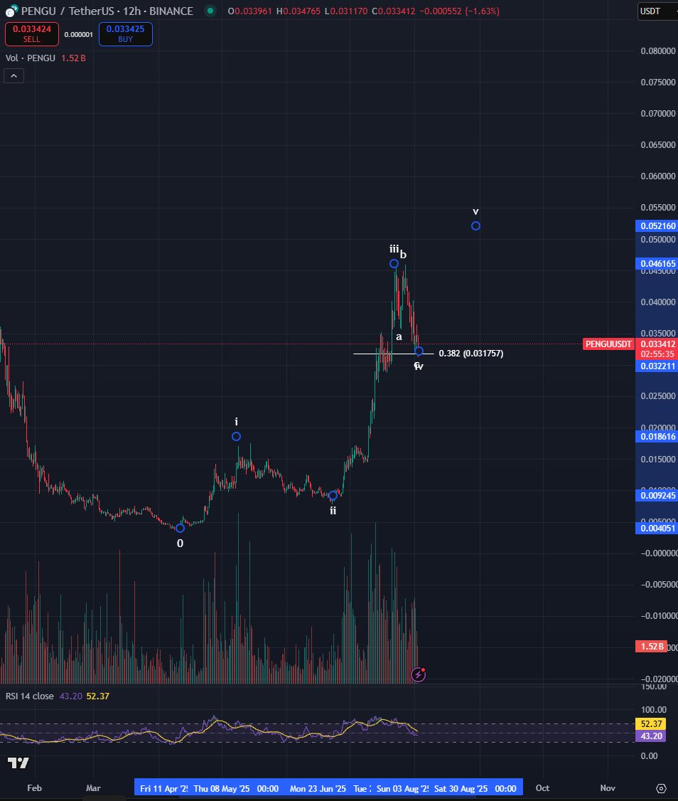 Trying on the dealer’s chart, he appears to foretell that PENGU will soar above $0.05 earlier than ending its five-wave rally. At time of writing, PENGU is value $0.0357, up over 7% previously day.