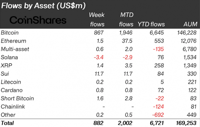 CoinShares’ researcher James Butterfill notes that Bitcoin led the cost with $867 million in inflows, reflecting its rising position as a macro hedge amid rising financial uncertainty.