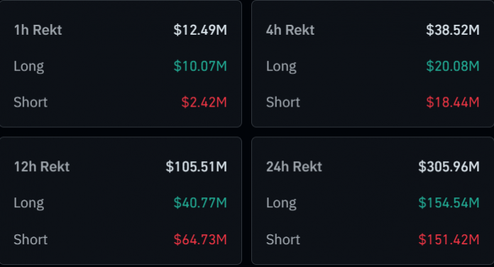 As is seen, liquidations have totaled at virtually $306 million on this window. Out of those, $154 million of the contracts concerned had been lengthy positions, whereas $151 million had been brief ones.