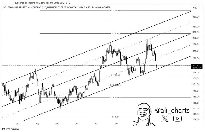 Analyst Ali Martinez tells his 122,400 followers on the social media platform X that Solana is in peril of plunging to ranges final seen in October of 2024.