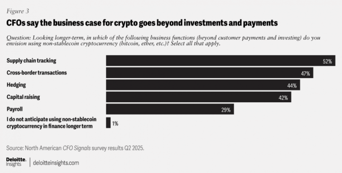 A Deloitte survey printed in July polled 200 Chief Monetary Officers working at firms with a minimum of US$1 billion in revenues on the subject of tokenization. The survey confirmed that the majority CFOs count on their enterprise to make use of “cryptocurrencies for enterprise features in the long run.” Just one% of these polled mentioned they didn’t envision it. And 23% mentioned their treasury departments “will make the most of crypto for both investments or funds inside the subsequent two years,” a proportion which is nearer to 40% for CFOs at organizations with US$10 billion in revenues or extra. Additionally, of these surveyed, solely “2% of respondents mentioned they haven’t had any conversations about cryptocurrency with key stakeholders”.