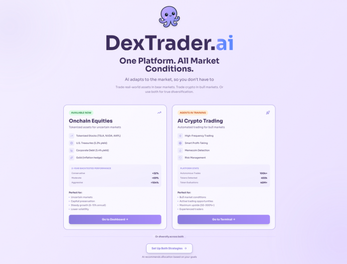 DexTrader.ai solves two of essentially the most prevalent issues confronting crypto buyers: the problem of constantly buying and selling fast-moving DEX markets, and the dearth of dependable diversification when volatility spikes. The platform addresses each points straight by combining a sophisticated DEX buying and selling engine that evaluates tokens throughout greater than 80 standards with direct entry to tokenized shares, U.S. Treasuries, company bonds, and gold, all whereas remaining 100% decentralized and self-custodied.