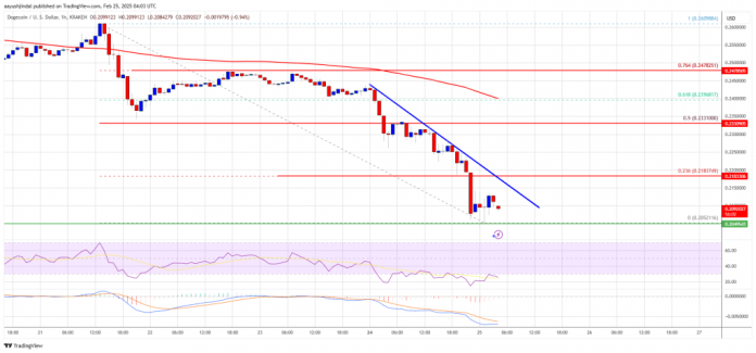 Dogecoin began a contemporary decline beneath the $0.250 zone towards the US Greenback. DOGE examined $0.2050 is now consolidating beneath the $0.2250 resistance.