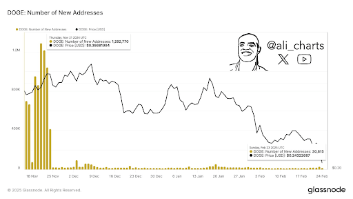 Past the crash in Dogecoin’s open curiosity, different metrics paint a bearish image for Dogecoin and recommend that the decline may proceed. In an X put up, Martinez revealed that DOGE’s community exercise has considerably contracted, with new handle creation dropping from 1.29 million in November to simply 30,815 immediately.