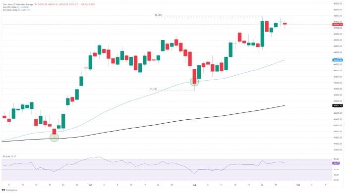 The Dow Jones is down, however definitely not out. The foremost fairness index continues to be holding firmly onto near-term positive factors and stays inside hanging distance of all-time highs north of 45,760. Bullish momentum has dried up in the intervening time, however the Dow continues to be discovering intraday help close to the 45,500 area.