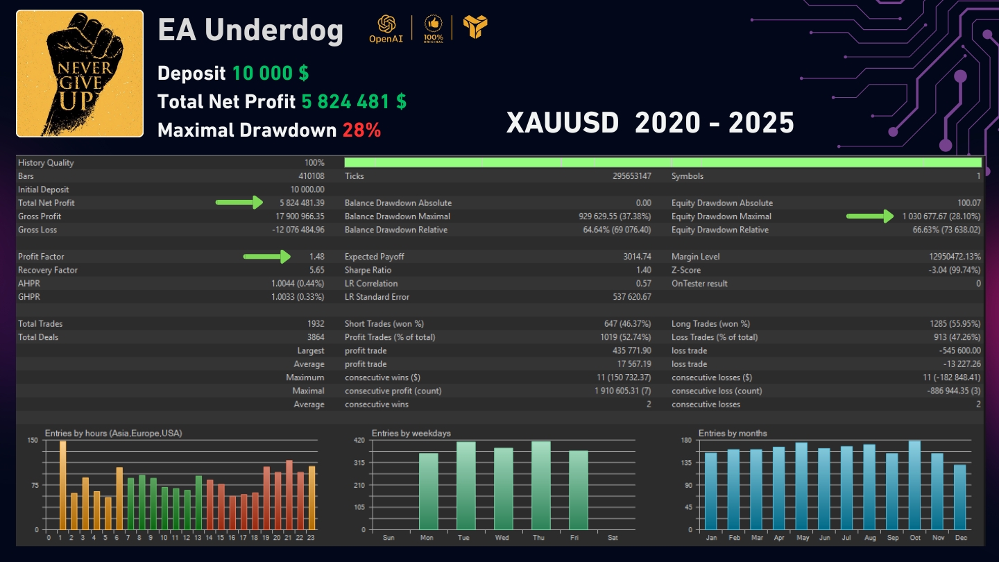 EA Underdog is knowledgeable professional advisor from Quantum Lab Applied sciences. It trades on worth divergence, makes use of no harmful strategies, makes use of solely strict Cease Loss and Take Revenue orders, and its execution stability is ensured by the QuantumCore system (educated and optimized on historical past from 2020 to 2025).