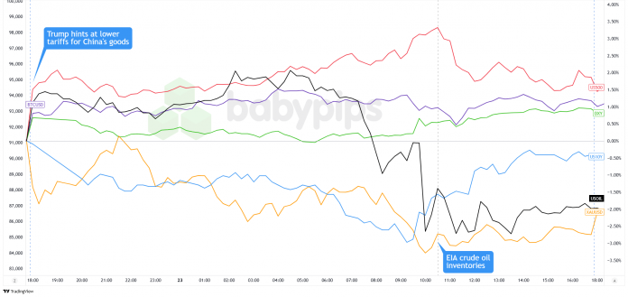 The main belongings had been everywhere in the charts on Wednesday after U.S. President Trump softened his stance on two key points. He stated he had no intention of firing Fed Chair Powell, although he nonetheless needs decrease rates of interest. On China commerce, Trump stated the 145% tariffs “will come down considerably” and he could be “very good to China,” although warning Washington would dictate phrases if no deal emerges.