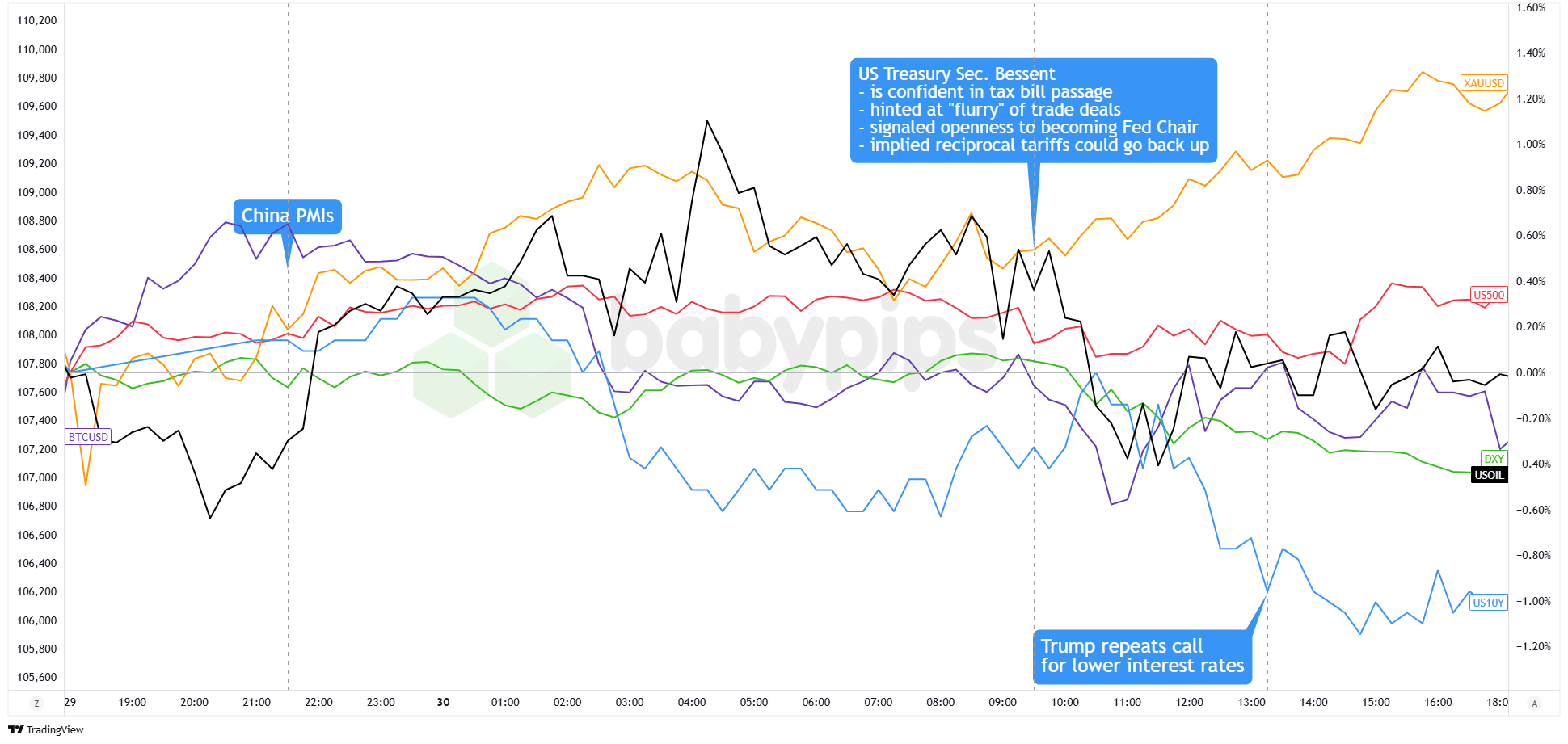 Crude oil eased up a bit, with WTI settling at $64.90, regardless of locking in a month-to-month achieve. Merchants appeared cautious after China’s PMI numbers despatched combined indicators on demand. Bitcoin didn’t be part of the social gathering both, slipping from $108,800 to round $107,200 and staying out of sync with the broader risk-on vibe.