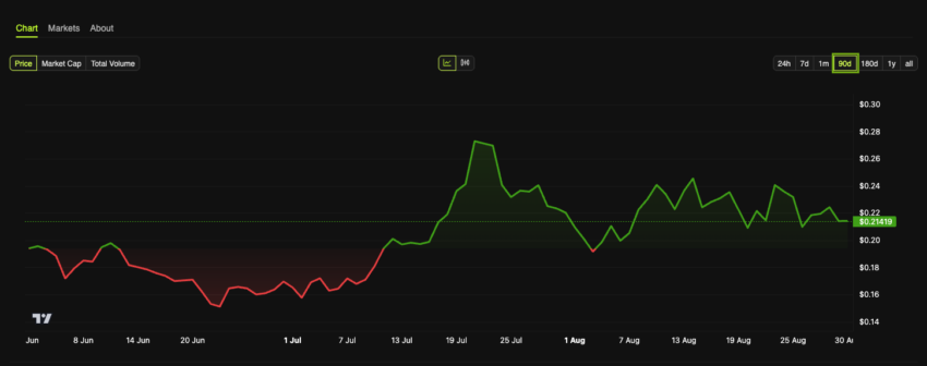 Dogecoin has remained range-bound since mid-March, fluctuating between $0.15 and $0.25.