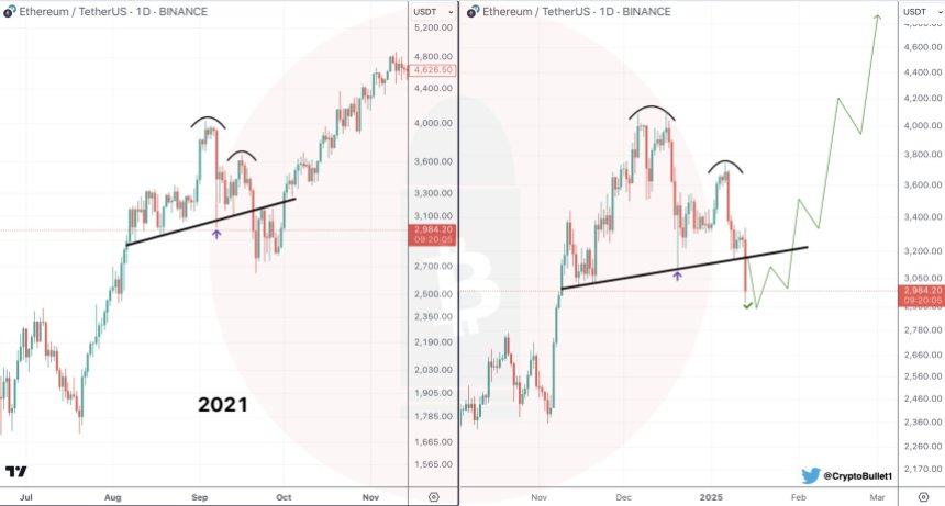 Analyst Crypto Bullet identified that ETH’s chart resembled its 2021 conduct. The chart exhibits Ethereum noticed a Double High sample throughout its rally over three years in the past. Then, the cryptocurrency fell under the important thing help zone of $3,100, confirming the sample.
