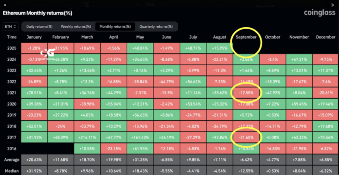 Based on CoinGlass, historical past affords a cautionary be aware: there have been solely three circumstances since 2016 the place Ether rose in August after which slid in September.