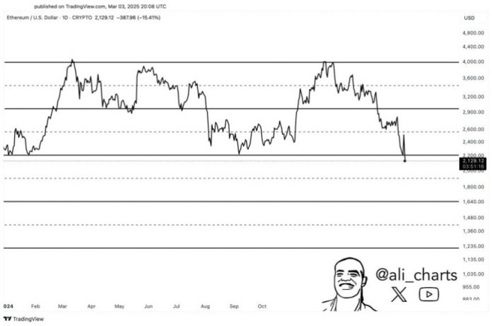 Analysts are intently monitoring Ethereum’s value motion, as the following few days may decide the short-term outlook for the second-largest cryptocurrency. High analyst Ali Martinez shared a technical evaluation on X, suggesting that Ethereum is on the verge of breaking out of a parallel channel to the draw back. If this push beneath the $2,000 mark occurs, ETH could possibly be set for a deeper correction earlier than any restoration makes an attempt.