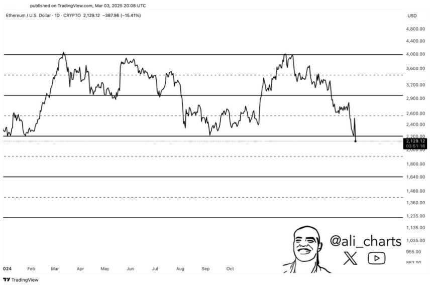 With Ethereum failing to indicate energy amid market volatility, traders stay cautious, anticipating cheaper price ranges earlier than any significant restoration can happen. The approaching days will likely be essential in figuring out whether or not ETH can stabilize or if Martinez’s $1,250 goal will change into a actuality, confirming the bearish outlook for your entire crypto market.