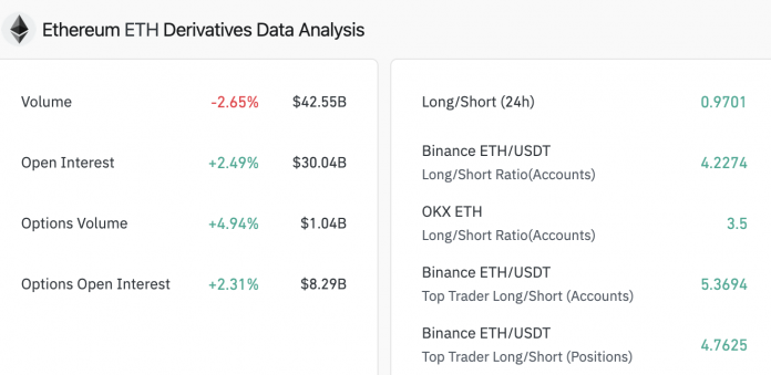 Ethereum derivatives knowledge on Coinglass exhibits an almost 47% enhance in choices commerce quantity up to now 24 hours, as derivatives open curiosity hovers round $30 billion. Choices quantity crossed $1 billion in a 24-hour timeframe.