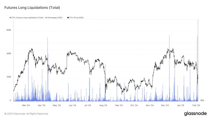 From the graph, it’s seen that the Ethereum futures market has simply witnessed a large quantity of lengthy liquidations. “Yesterday, $76.4M in ETH lengthy liquidations hit the market, with $55.8M worn out in a single hour – the second-largest spike in a 12 months, simply behind Dec 9’s $56M,” notes Glassnode.