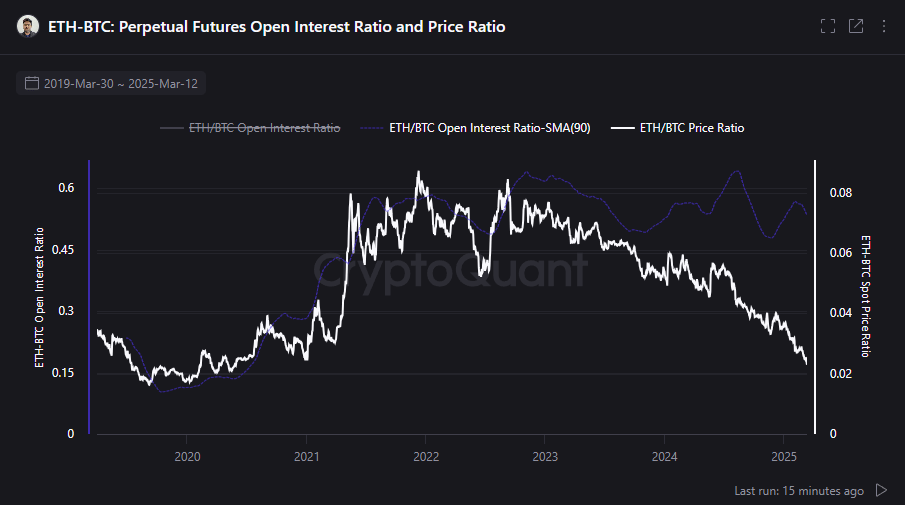 By March 2025, the open curiosity ratio of ETH futures had fallen to 0.15, whereas the ETH/BTC value ratio dropped to 0.02. This means that the bearish sentiment round Ethereum continues to dominate the market, as merchants and traders shift their focus towards Bitcoin.