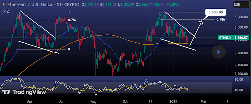 The TradingView analyst highlighted that the present falling wedge worth construction mirrors the March 2024 sample, which noticed Ethereum forming a triple backside earlier than breaking out and reaching the 0.786 Fibonacci extension stage. If the identical state of affairs unfolds, the present falling wedge might function a launchpad for a worth surge in direction of a goal on the $3,800 stage. This represents a possible 20% upside from Ethereum’s present buying and selling vary.
