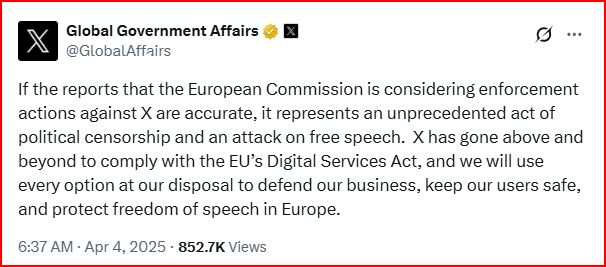 X’s international authorities affairs account hit again on the European regulators on Friday. “If the stories that the European Fee is contemplating enforcement actions towards X are correct, it represents an unprecedented act of political censorship and an assault on free speech,” X acknowledged.