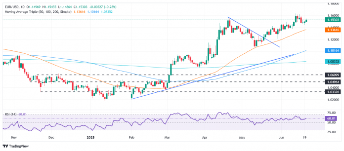 The Euro recovers some floor towards the US Greenback on Friday and is ready to complete the week nearly flat as threat urge for food deteriorates. That is going down regardless of US President Donald Trump delaying a navy intervention within the Israel–Iran battle. On the time of writing, the EUR/USD trades at 1.1534, up 0.36%.