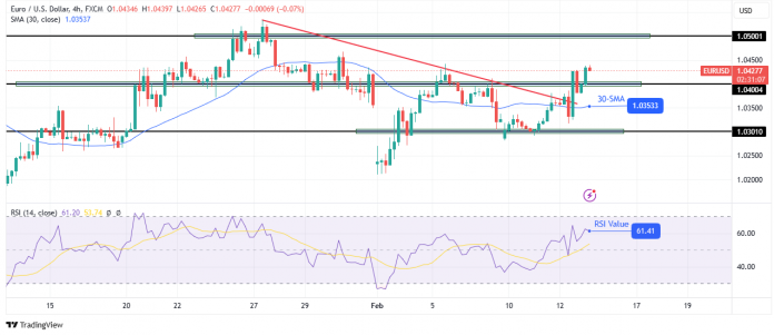 On the technical aspect, the EUR/USD worth has damaged above a robust resistance zone comprising the 30-SMA, a bearish trendline and the 1.0400 resistance stage. The break signifies a surge in bullish momentum that would result in a brand new uptrend.