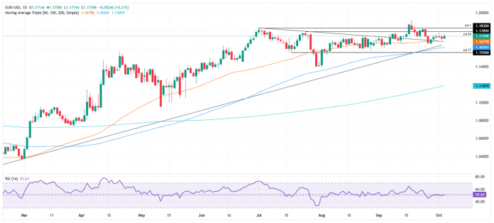 EUR/USD consolidates on Friday amid a quiet buying and selling session as a result of lack of a recent catalyst, sponsored by a US authorities shutdown that appears poised to increase past the present week. The pair trades at 1.1738, up 0.28%, on the time of writing.