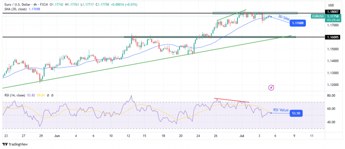 On the technical facet, the EUR/USD worth is rebounding after a pointy decline that punctured the 30-SMA assist line. The transfer got here after the RSI made a bearish divergence, indicating fading bullish momentum. Bulls weakened when the worth reached the 1.1800 resistance degree.