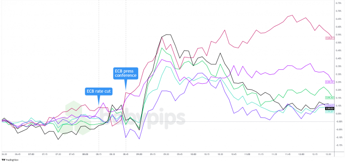 The euro spent a lot of the lead-up to the ECB resolution buying and selling in a good vary with a slight bullish lean. The foreign money additionally barely blinked after the anticipated 25 bps fee lower was introduced.