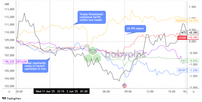 Threat belongings like bitcoin and fairness futures, together with Treasury yields and the greenback, edged progressively decrease whereas safe-haven gold and crude oil have been elevated, with the latter propped up by expectations of provide disruptions on potential assaults. Nonetheless, the vitality commodity quickly joined higher-yielding holdings within the selloff, as a CBS report cited sources saying that Israel is gearing as much as launch a navy operation in Iran.