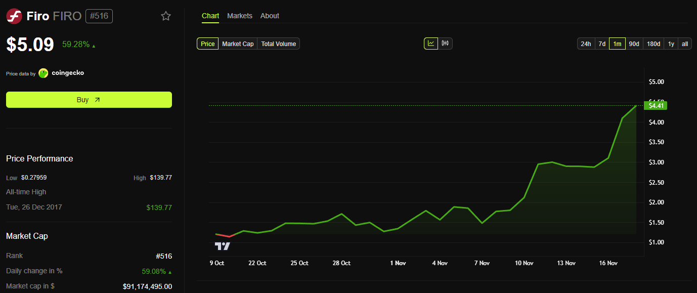 Firo (FIRO), a privateness coin with Bitcoin-like tokenomics, surged greater than 300% in November and returned to its 3-year excessive. With a market cap nonetheless beneath $100 million, many traders anticipate its rally to increase additional.