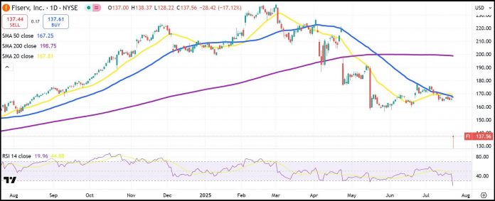 Fiserve inventory traded down from a previous shut close to $166 to as little as $128 in Wednesday’s morning session.