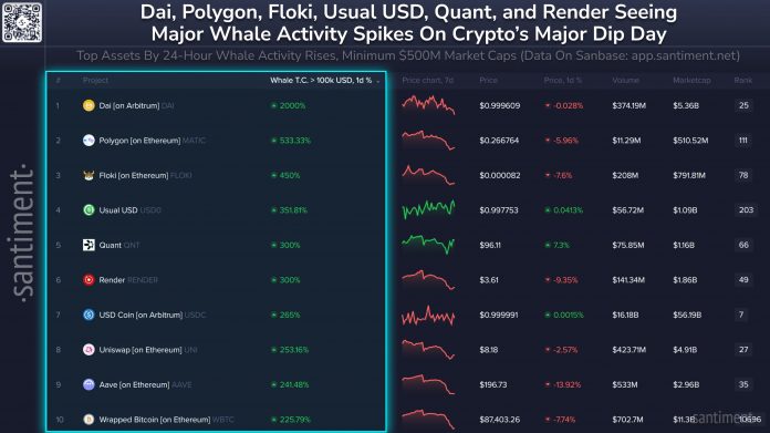 As is seen above, the Arbitrum model of the stablecoin Dai (DAI) has been the primary cryptocurrency within the checklist with its Whale Transaction Depend witnessing a spike of two,000% within the final 24 hours. Polygon (MATIC) and Floki (FLOKI) on the Ethereum blockchain have adopted up the stablecoin with whale exercise growths of 533% and 450%, respectively.