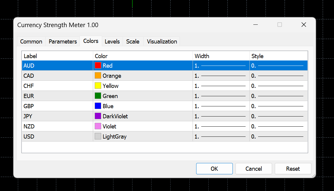There are a complete of 8 traces within the Historical past Panel, every representing the historic power of one of many main currencies. By default (should you haven’t personalized them throughout setup), these traces are pre-colored and ordered in keeping with the next foreign money record: