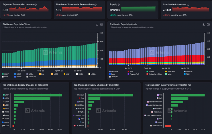 With regulatory frameworks for stablecoins step by step taking form, stablecoins have up to now yr develop into core infrastructure for each the crypto monetary system and cross-border funds. Whether or not serving retail traders’ buying and selling wants or enabling establishments in clearing, settlement, and compliance pilots, stablecoins more and more perform as “digital {dollars}.”As of September 2025, the overall circulation of stablecoins reached $287 billion, with a extremely concentrated market construction. Tether’s USDT holds roughly 59.6% of the market share (over $170.9 billion market cap), adopted by Circle’s USDC at 25% ($74.2 billion). Collectively, the 2 account for practically 85% of the market. On the identical time, new entrants comparable to USDe, USDS, USD1, and USDf are rising quickly into the mainstream.