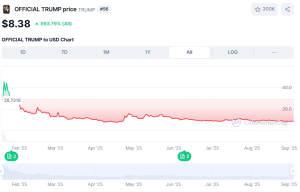 The TRUMP worth has plunged greater than 7% up to now 24 hours to commerce at $8.38 as of 5:05 a.m. EST, in keeping with information from CoinMarketCap.
