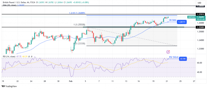On the technical aspect, the GBP/USD worth has risen to make the next excessive within the uptrend. This bullish transfer comes after the value discovered assist on the 30-SMA. In the meantime, the RSI trades close to the overbought area, indicating stable bullish momentum.