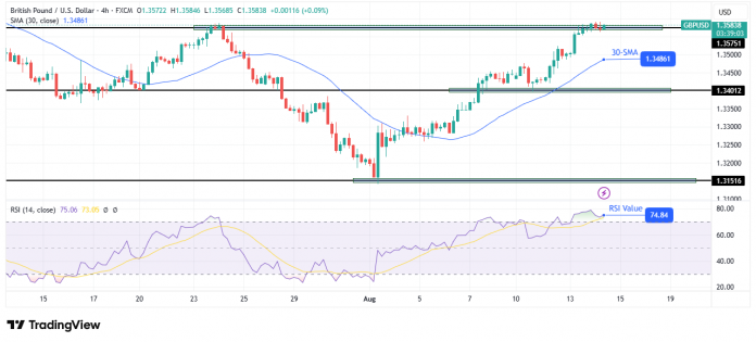On the technical aspect, the GBP/USD worth has made new highs, pausing close to the 1.3575 key resistance degree. The worth now sits properly above the 30-SMA, exhibiting bulls have a robust lead. In the meantime, the RSI trades within the overbought area, suggesting strong bullish momentum.