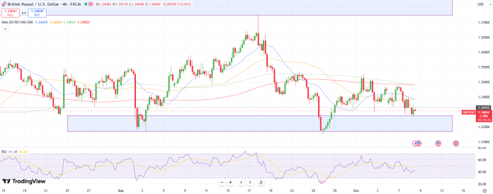 The GBP/USD 4-hour chart signifies bears gaining traction as the value lies under the 50-, 100-, and 200-period shifting averages. This confirms a declining construction. The latest rejection near the 50-MA indicators that whereas sellers defend increased ranges, the pair nonetheless fails to keep up the 1.3440-1.3460 zone, confirming the downtrend.