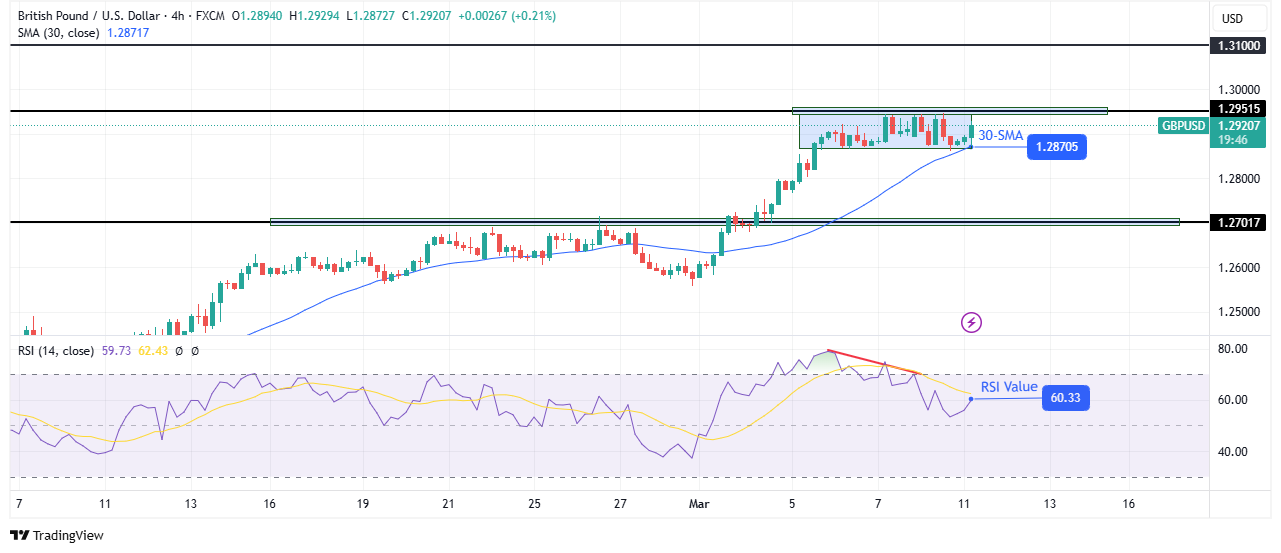 On the technical facet, the GBP/USD worth has met a strong hurdle on the 1.2951 stage. Nonetheless, the value nonetheless trades above the 30-SMA, with the RSI above 50, indicating a bullish bias. The worth rose steeply after breaking above the pivotal 1.2701 resistance stage.