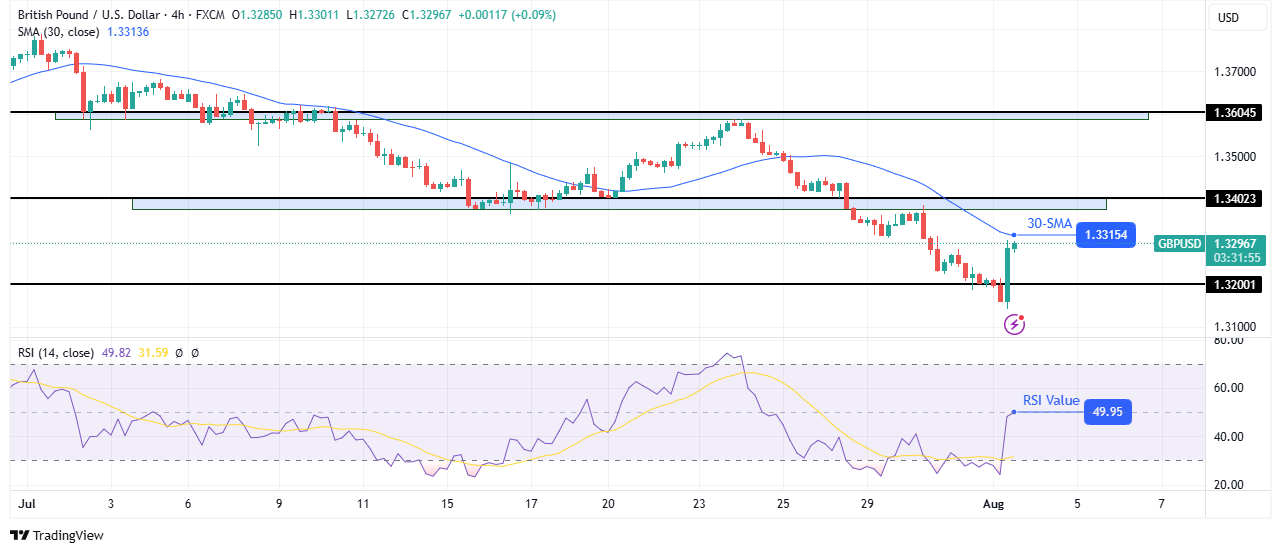 On the technical facet, the GBP/USD value has recovered to the 30-SMA and is difficult the prevailing pattern. Bulls emerged quickly after the worth broke beneath the 1.3200 key assist degree. There was a sudden surge in momentum that allowed the worth to type a bullish engulfing candle.