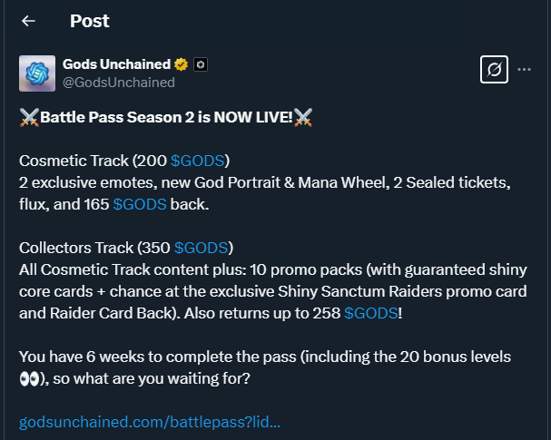 • Season 2 of the Gods Unchained Battle Move is now stay with two simplified tracks: Beauty and Collector, specializing in unique visible upgrades and tradable promotional content material.