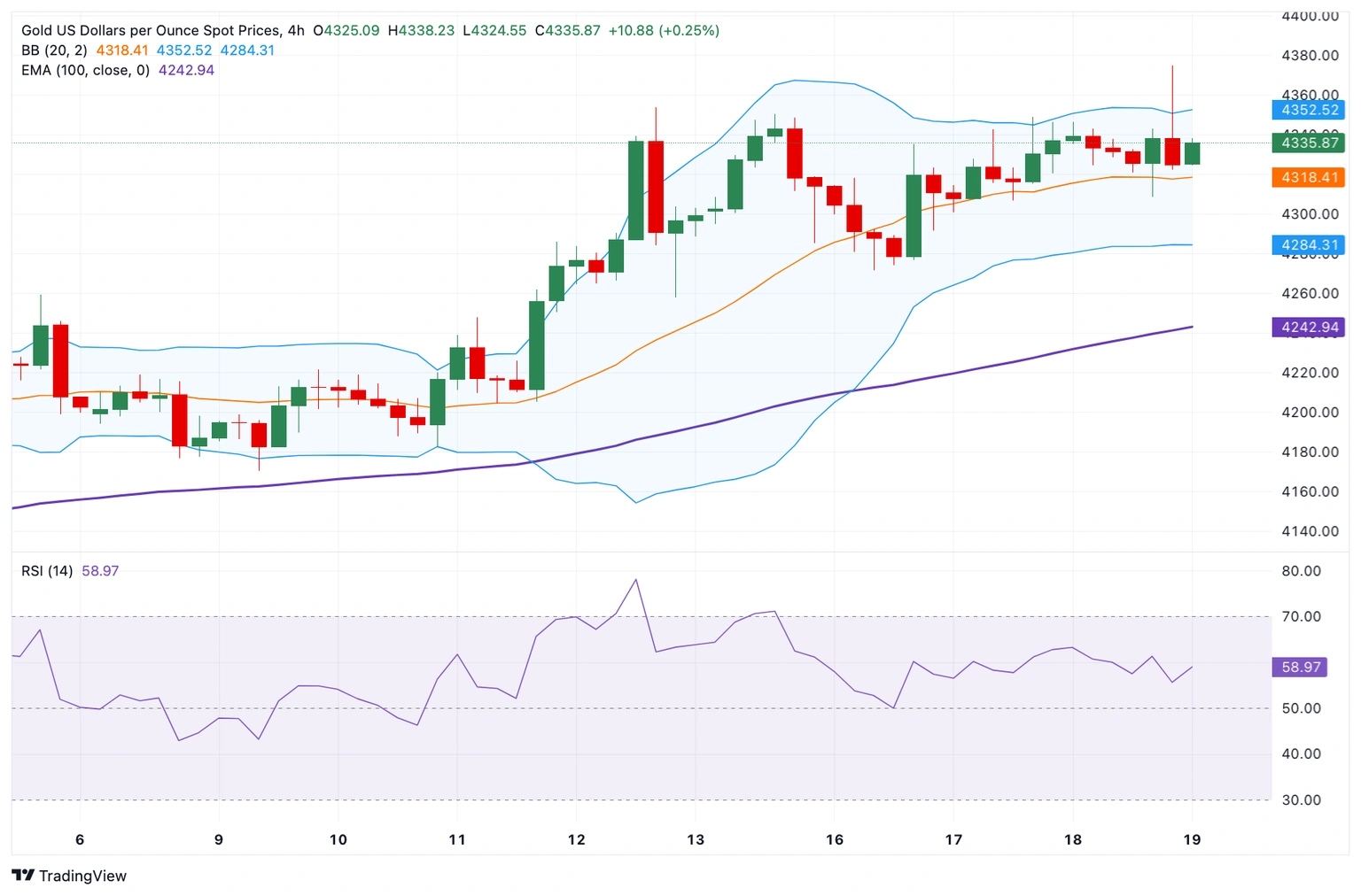 The primary upside barrier for XAU/USD emerges on the higher boundary of the Bollinger Band of $4,352. A decisive break above this degree may recommend that consumers are prepared to leap in and maintain the climb again to an all-time excessive of $4,381, en path to the $4,400 psychological mark.