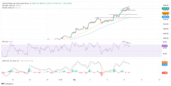 Gold (XAU/USD) is consolidating slightly below its file peak close to $3,660 reached earlier on Tuesday, with intraday worth motion exhibiting a decent vary above $3,640 assist. The 50-hour Easy Shifting Common (SMA) at $3,613 and the 100-hour SMA at $3,581 are sloping larger, highlighting the underlying bullish bias.