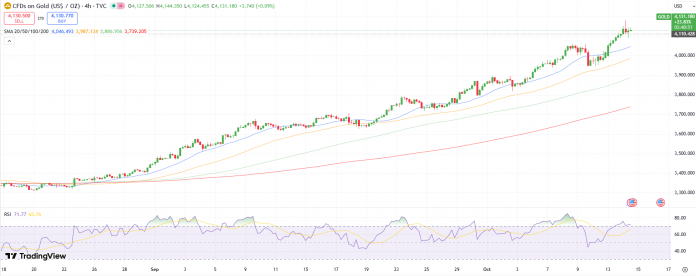 The XAU/USD 4-hour chart signifies the metallic holds regular beneath the file excessive across the $4,180 stage after a pointy uptrend, signaling profit-taking whereas holding a bullish bias. The value holds above the important thing MAs, indicating an uptrend. The 20-MA is round $4,050, the 50-MA holds close to $3,988, and the 100-MA is at $3,887, performing as sturdy help ranges.