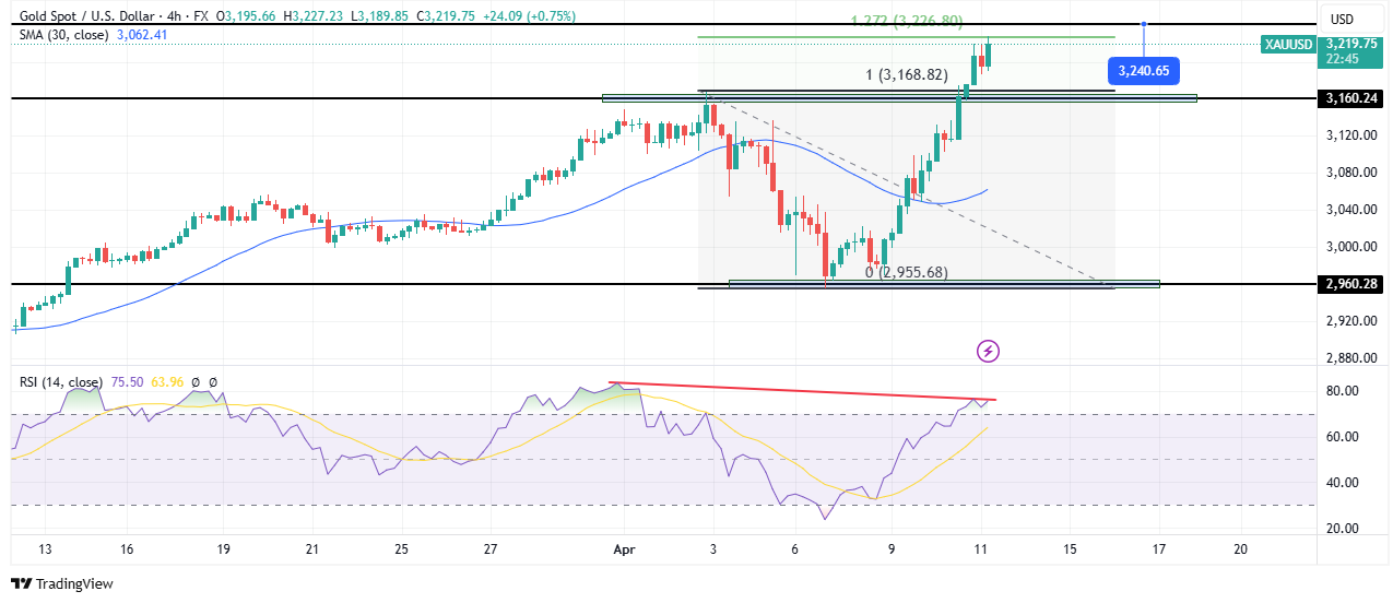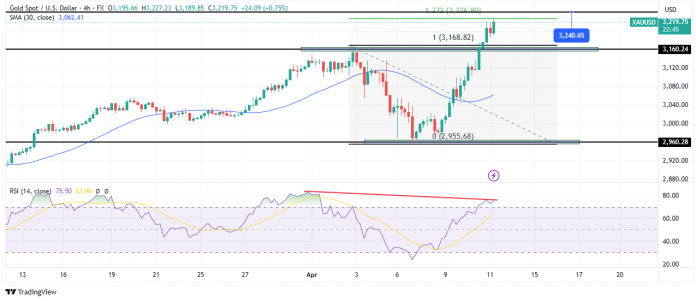 Furthermore, bulls are approaching a robust resistance zone, comprising the 1.272 Fib extension stage and the 3240.65 resistance stage. On the identical time, the RSI has made a bearish divergence, which may result in a pullback. Nonetheless, the bullish bias is robust, and gold would possibly proceed making new highs.