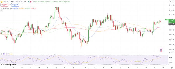 The 4-hour chart for gold reveals no clear bias because the markets consolidate beneficial properties. The important thing shifting averages stay in a cluster at $3,340-55 space. The worth stays shy of $3,400 degree, which is vital for the consumers to proceed the upside momentum. The 20- and 100-period MAs are converging to kind a bullish crossover. If confirmed, it may set off shopping for strain as nicely.