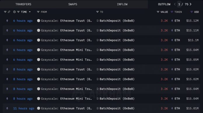 In response to onchain information from Lookonchain, Grayscale (ETHE and ETH ETF) staked 32,000 ETH, value roughly $150.56 million, earlier immediately. This transfer represents one of many largest institutional staking transactions in latest weeks and indicators rising confidence amongst main gamers in Ethereum’s long-term worth proposition. The choice to allocate such a big quantity of ETH to staking underscores the continued institutional perception in Ethereum’s twin position as each a know-how platform and a yield-generating asset.
