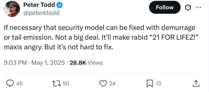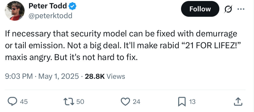 Peter Todd has proposed rethinking the sacred cap totally, introducing a small, regular inflation price to maintain miners incentivized when block rewards finish. It’s a controversial thought, however one gaining traction amongst these nervous about future safety dangers.