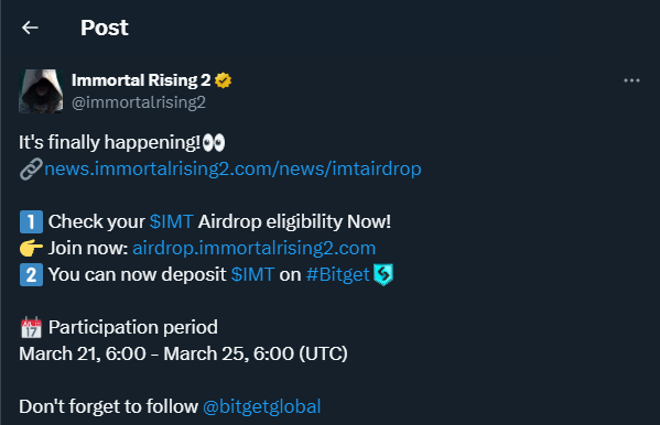 Immortal Rising 2 has formally launched all the important thing data relating to the upcoming $IMT airdrop, a serious occasion for gamers and Web3 fans alike. The airdrop declare course of kicks off on March 21 at 6 AM UTC. Those that participated in prior ORB missions, referrals, or Launchpool seasons 1, 2, or 3 can examine their eligibility and declare quantity via the venture’s official airdrop web page.