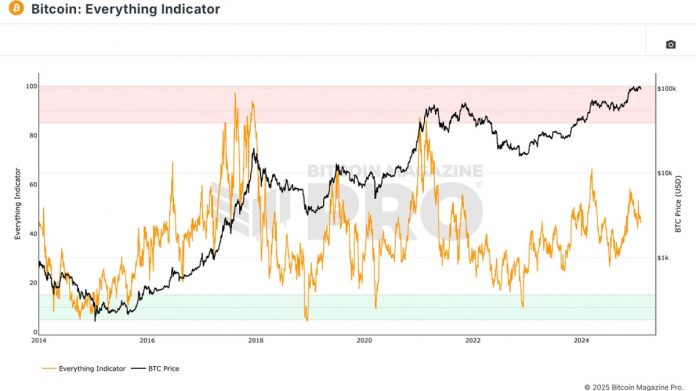 Traders and analysts sometimes depend on numerous metrics, similar to on-chain knowledge, technical evaluation, and by-product charts. Nevertheless, focusing an excessive amount of on one facet can result in an incomplete understanding of Bitcoin’s value actions. The Bitcoin All the pieces Indicator makes an attempt to resolve this by integrating key parts into one clear metric.